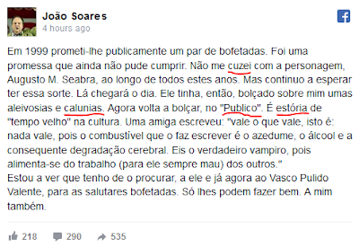 Já em Abril de 2016, João Soares como Ministro da Cultura, provoca mais um escândalo exibindo o baixo nível cultural e a fraca democracia que domina as mentes dos representantes do PS.Sócrates chorava e insultava jornalistas para não o denunciarem.