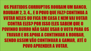 Também dizem que não votam porque votar dá 3 euros por cada voto aos partidos, acéfalos não entendem que para os corruptos 3 euros não é nada quando eles roubam 3 milhões por dia quando chegam ao poder, porque tu não foste votar noutro e o deixaste ganhar com meia dúzia de votos.